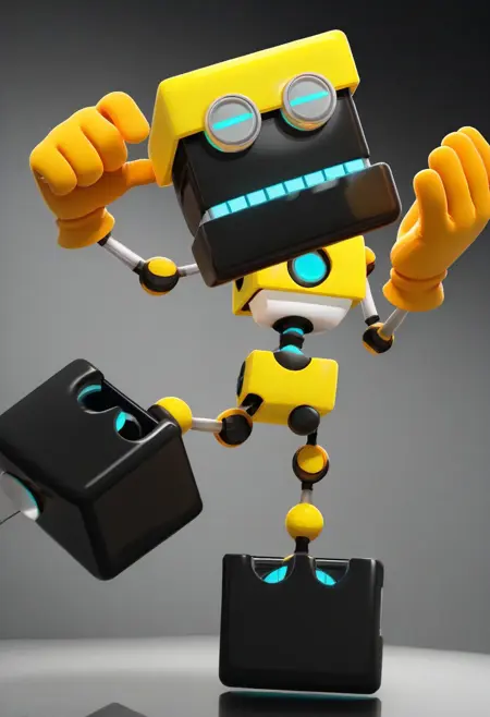 Cubot, yellow robot, two gray-framed and pupil-less light blue eyes, yellow gloves, black square head with a yellow square cap on top
