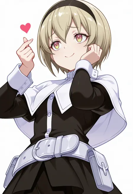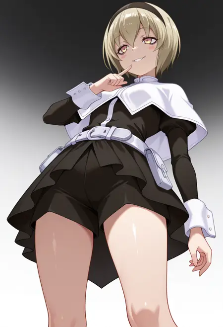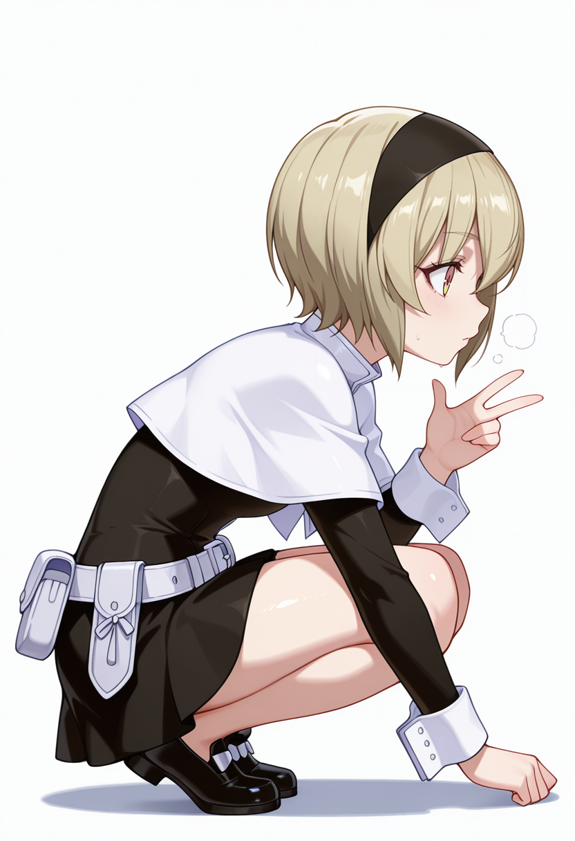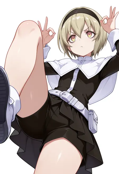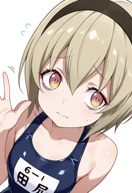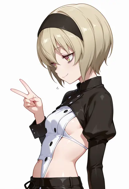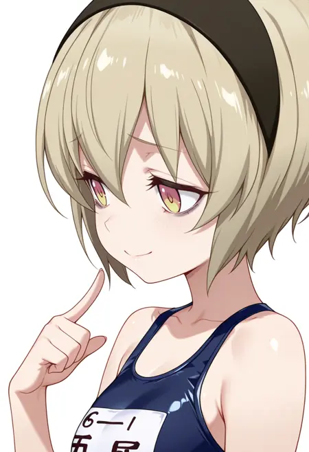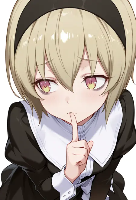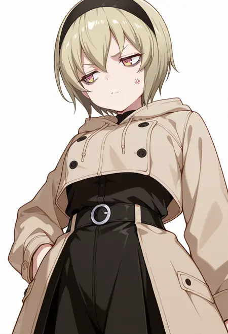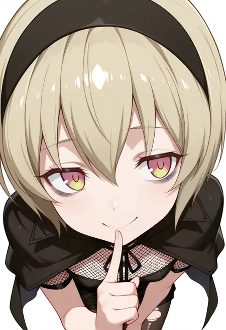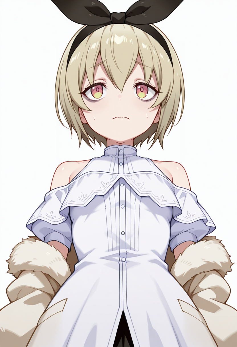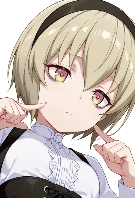 pekora_cnr, 1girl, blonde hair, short hair, bangs, yellow eyes, multicolored eyes, shiny hair black hairband,bags under eyes,