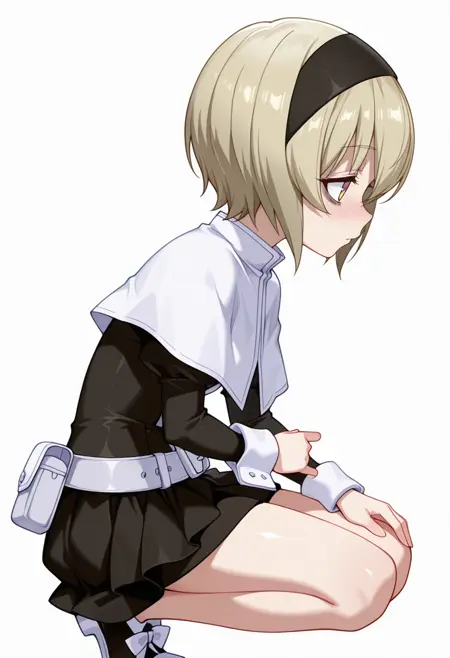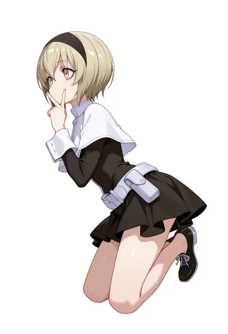 pekora_def_cnr, black dress, white capelet, black skirt,white belt, long sleeves, shoes, pouch,