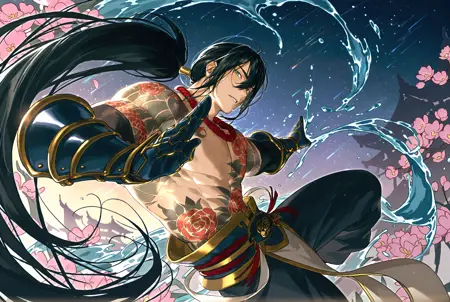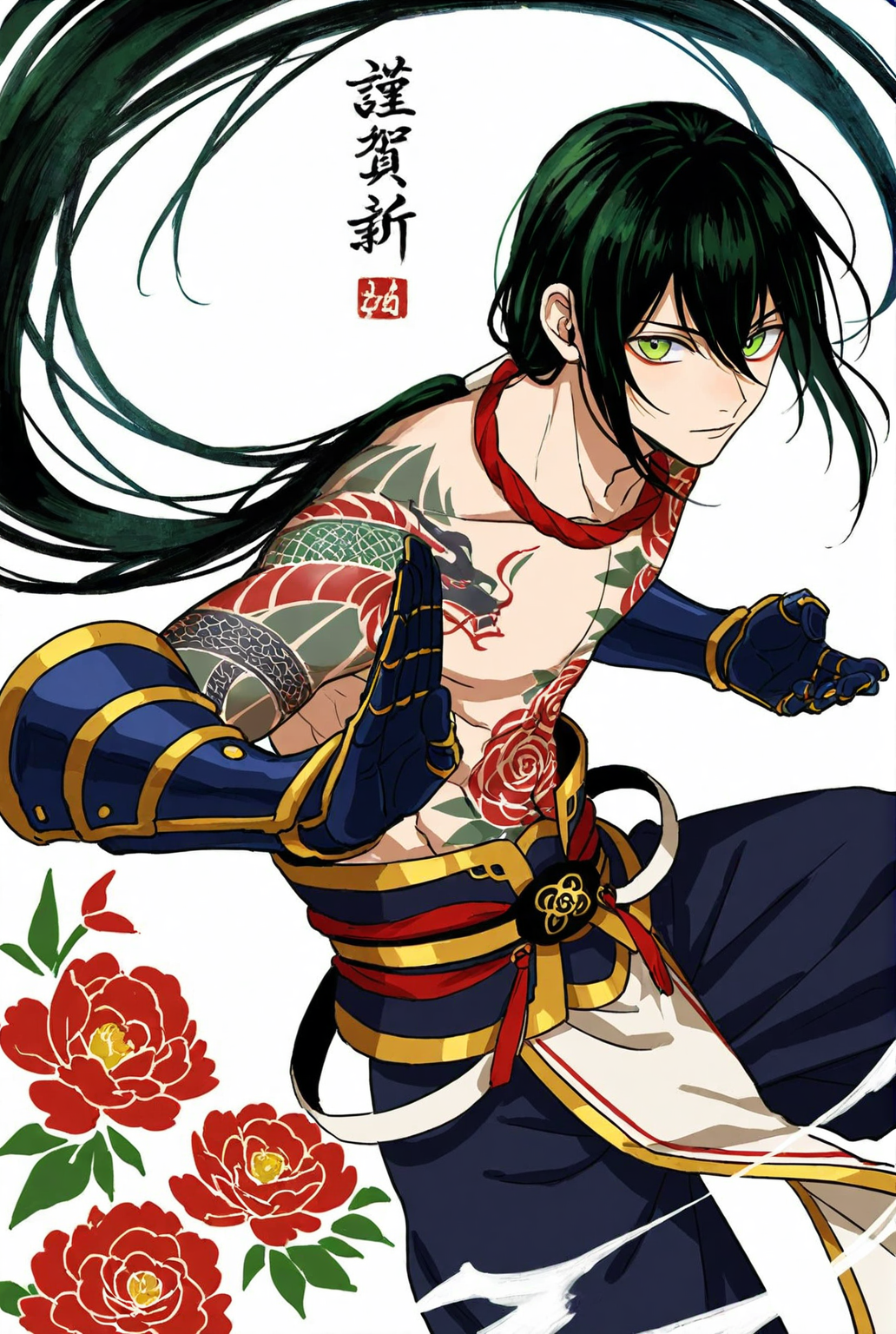 yanqingfgo, 長い髪, タトゥー, 黒髪, 非常に長い髪, ポニーテール, 緑の目, ガントレット, 胸のタトゥー, 花のタトゥー, 裤