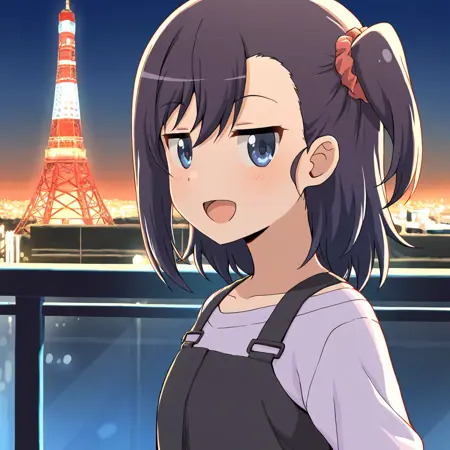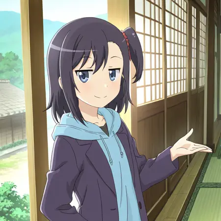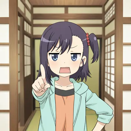 Miyauchi hikage (Non Non Biyori),black hair,short hair,blue eyes,one side up,hair ornament,small breast
