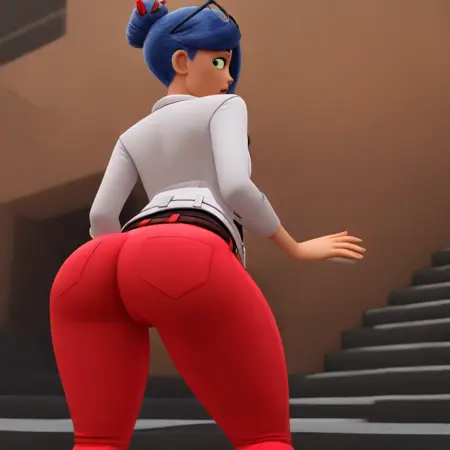MelissaBaker, cyan eyes, blue hair, hair bun, pen in hair, glasses on head, belted jacket, low cut shirt, red pants, brown boots, belt,