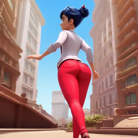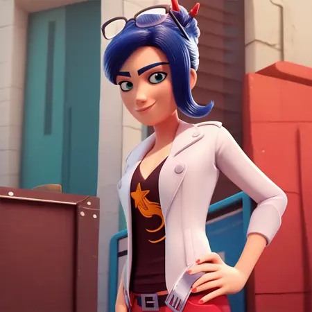 cyan eyes, blue hair, hair bun, pen in hair, glasses on head, belted jacket, low cut shirt, red pants, brown boots, belt,
