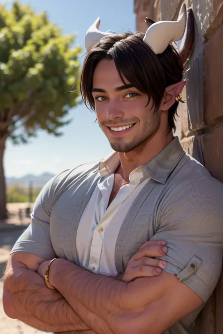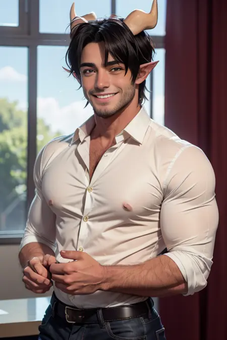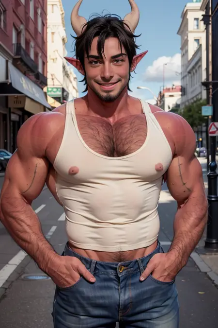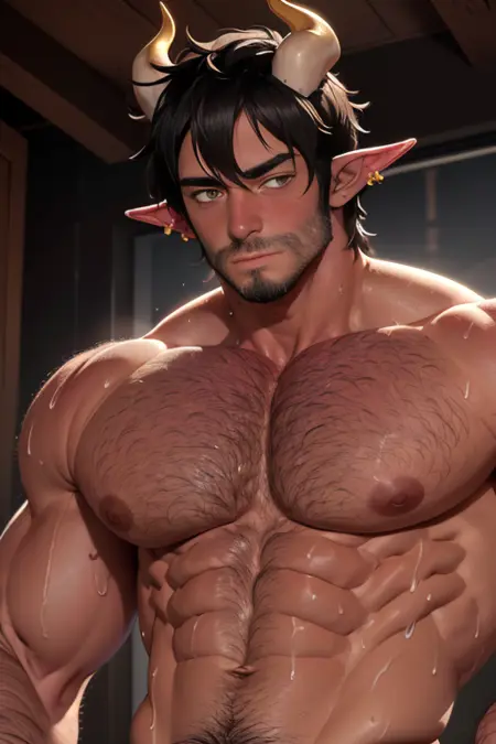 Dom: "muscular, demon horn, coloured skin, red skin, yellow eyes, ear piercing, stubble"