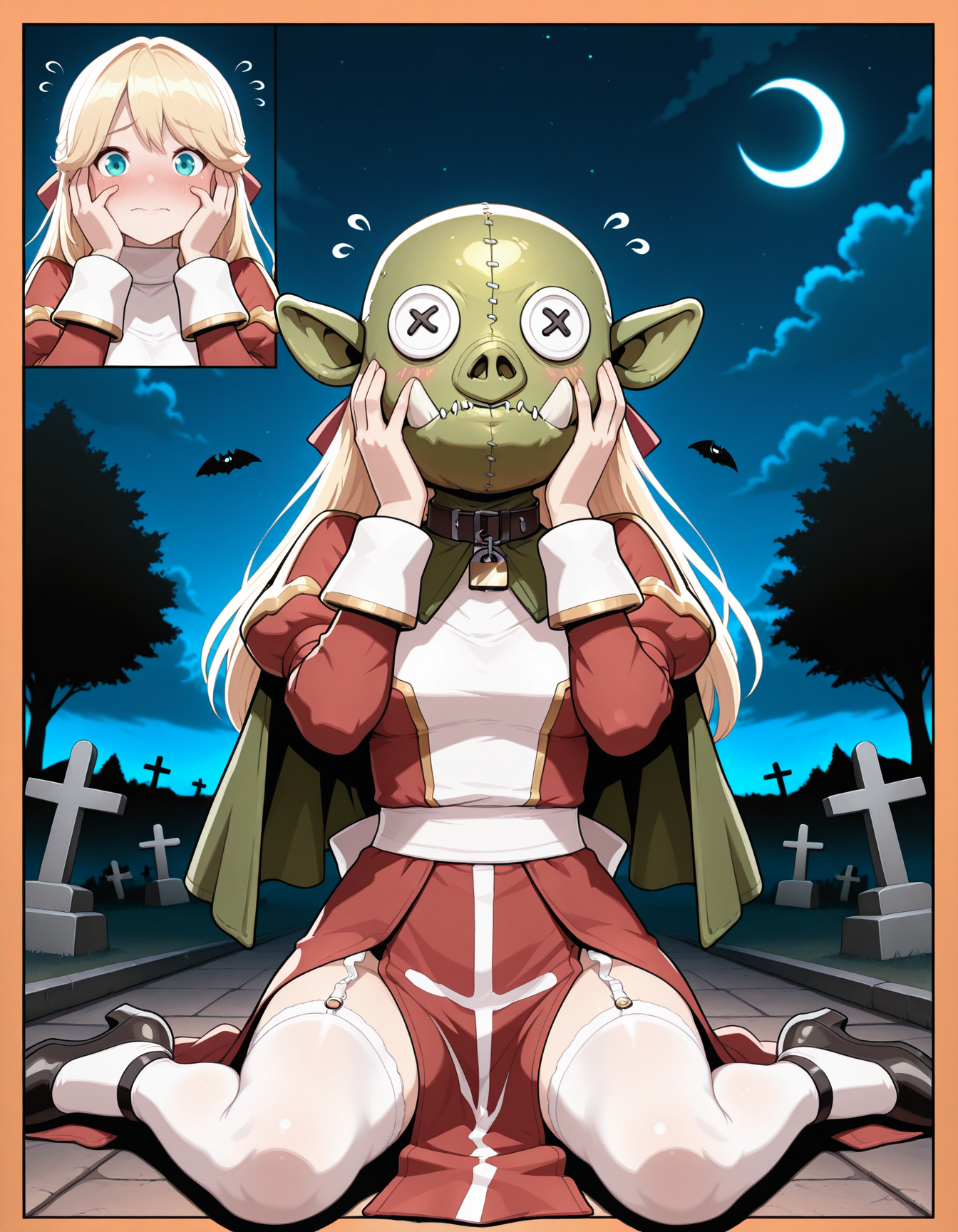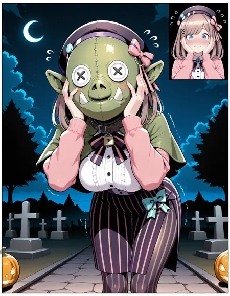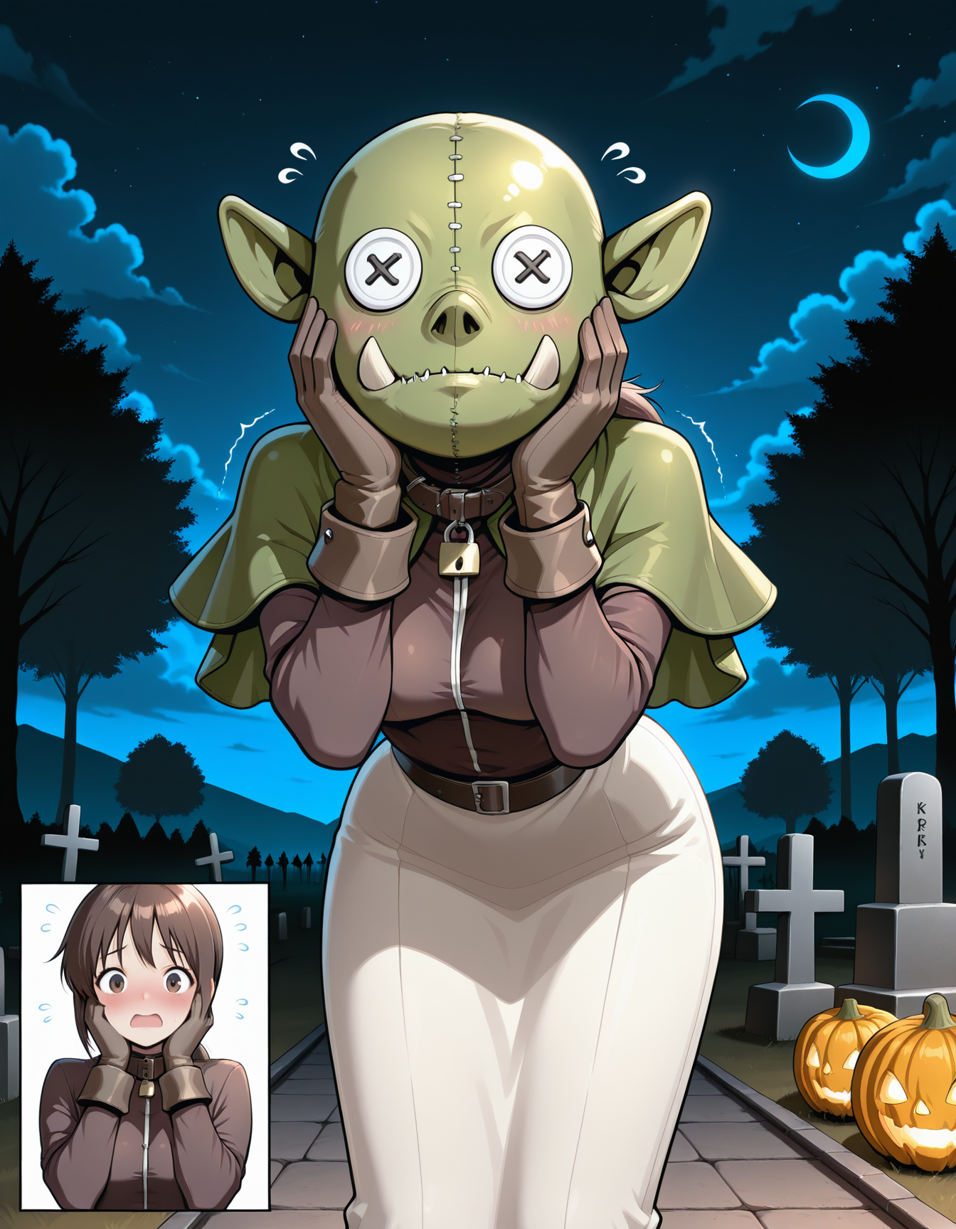 orcish, mask, button eyes, cosplay, covered face, padlock, animal collar, covered neck, green capelet, skinny, orc, stitched,