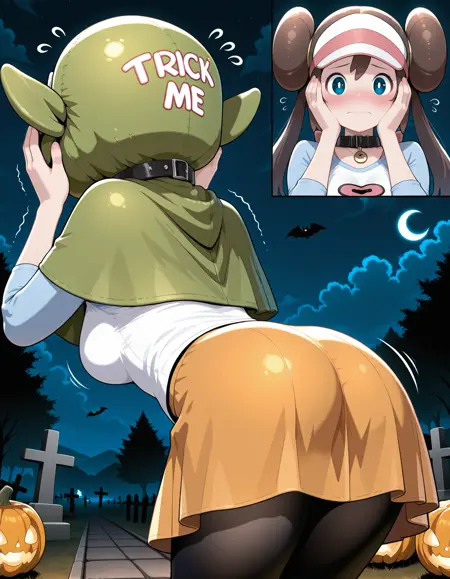 orcish, mask, cosplay, covered face, animal collar, green capelet, hooded capelet, hood up, from behind, english text, "TRICK ME",