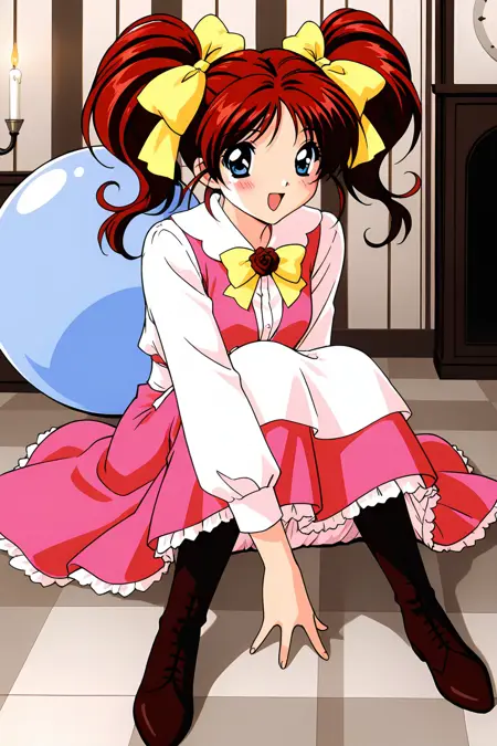 yellow ribbon,white shirt,collared shirt,long sleeves,puffy sleeves,yellow bowtie,red rose,neck flower,pink dress,sleeveless dress,pinafore dress,white apron,waist apron,back bow,frilled dress,petticoat,drawer,knee boots,lace-up boots,brown footwear,