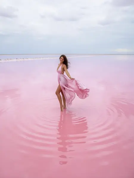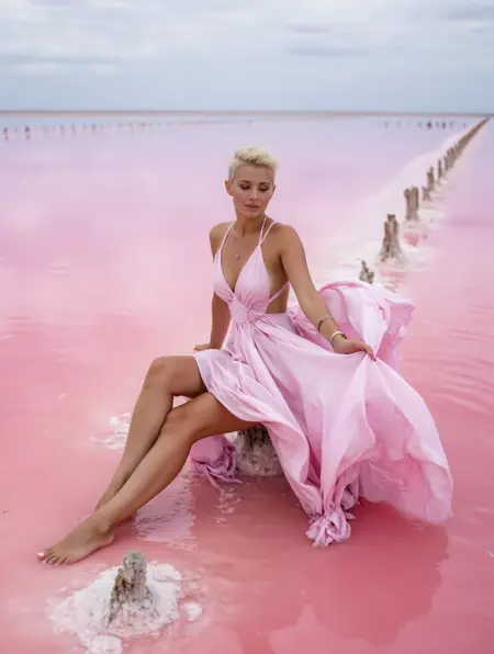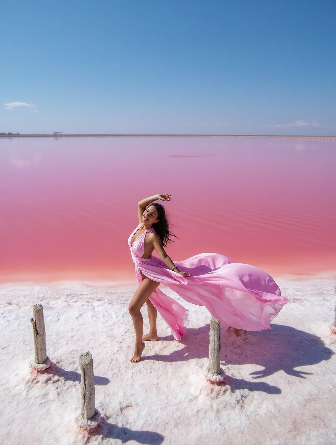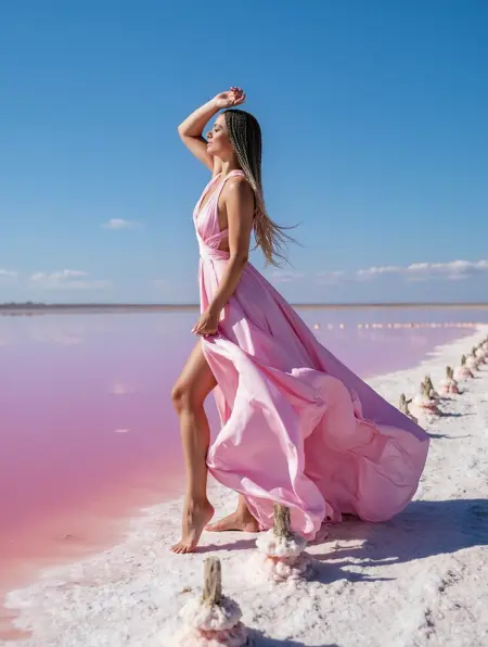 크림의 소금물 분홍호수 사시크-시바스에서의 사진 촬영 개념.