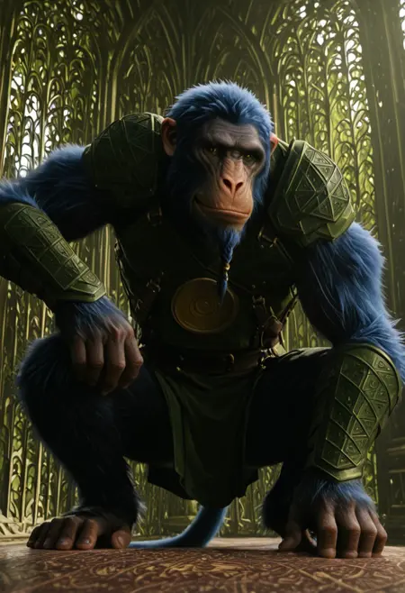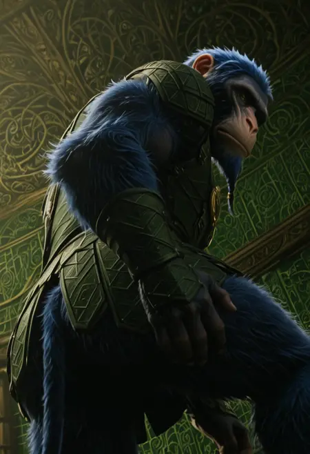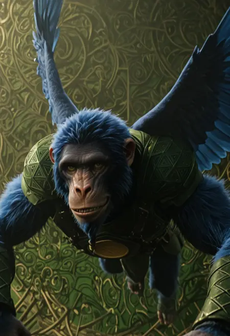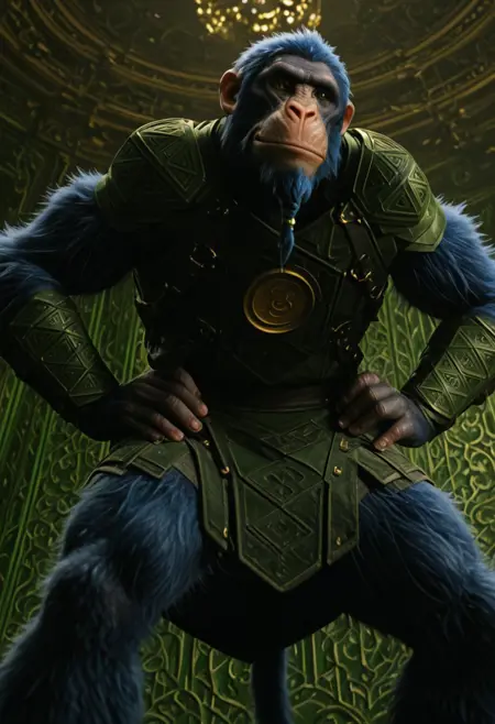 chistery_wicked, 1boy, male ape, furry, blue fur, scarred face, ape ears, blue hair, green and orange eyes (heterochromia), short braided beard, blue wings, long blue tail, green armor (golden plate on chest), green bracers,