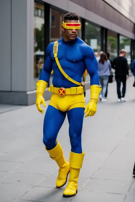 **"Superhero Cosplay"**라는 문구만 사용하면 됩니다. 단, 사이클롭스와 같은 복잡한 의상의 경우 벨트, 갑옷, 장갑 등 의상 구성 요소를 구체적으로 묘사해야 합니다.