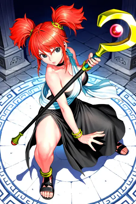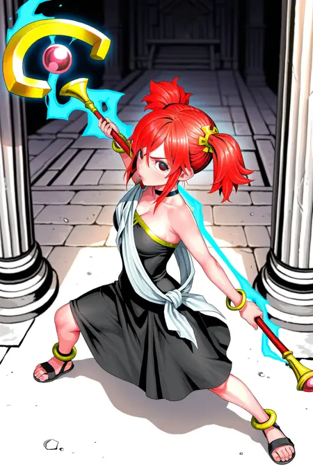 1girl, red hair, short twintails, hair ornament, black eyes, lips, choker, white sash, strapless black dress, bracelets, anklets, black sandals