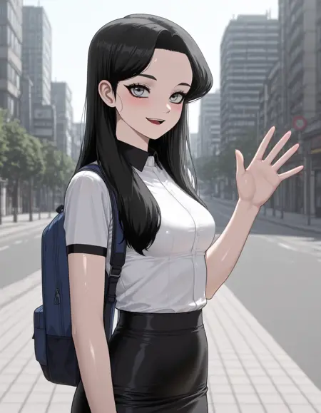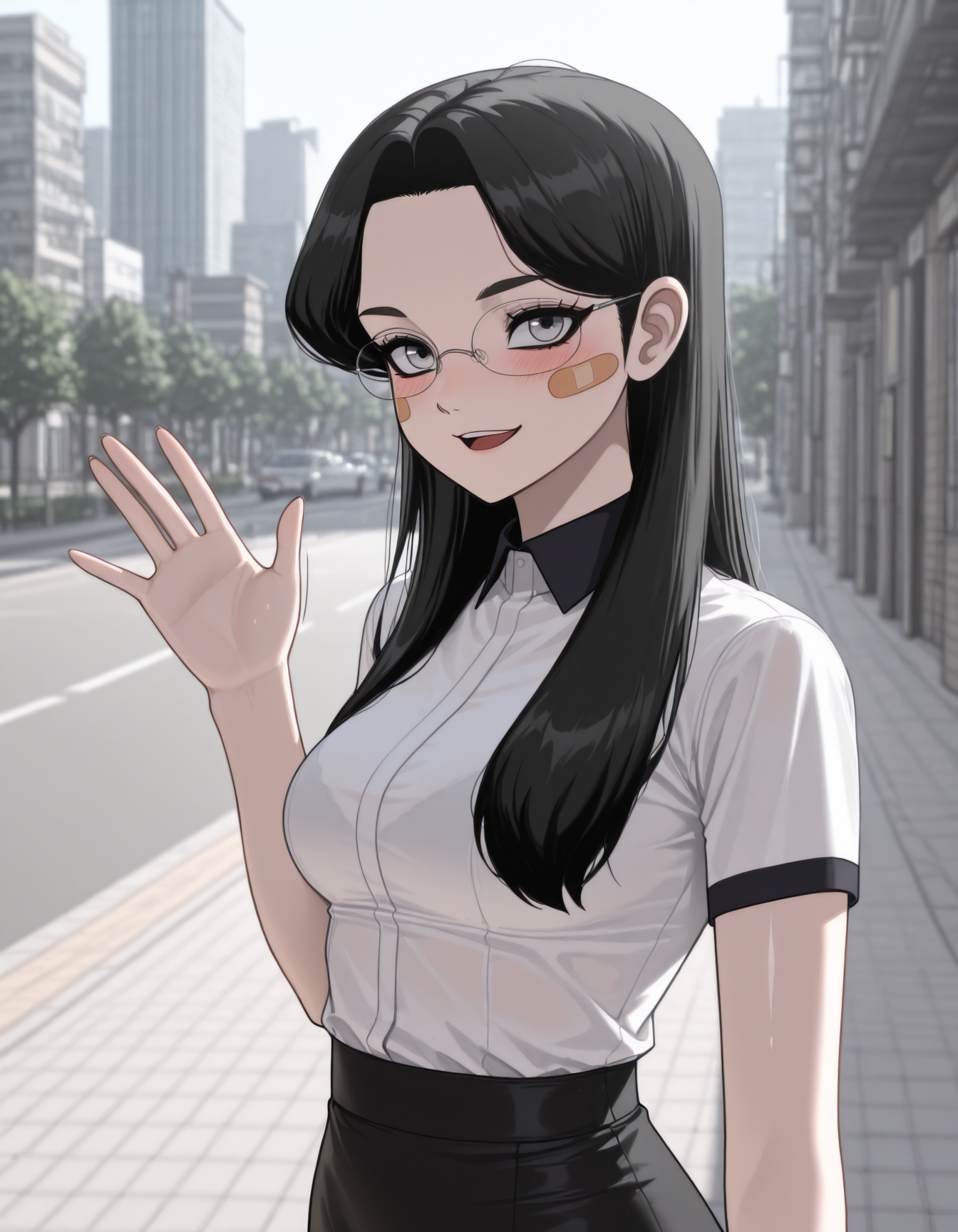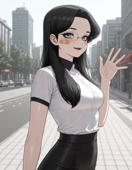 yejin moon, 1girl, solo, long hair, black hair, hair over shoulder, grey eyes, collared shirt, white shirt, short sleeves, black skirt, pencil skirt,