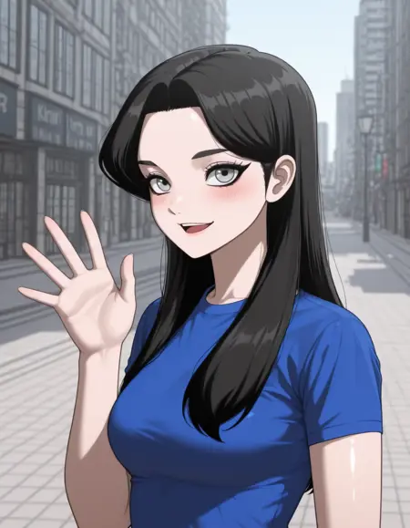 yejin moon, 1girl, solo, long hair, black hair, hair over shoulder, grey eyes, short sleeves, t-shirt, blue shirt,