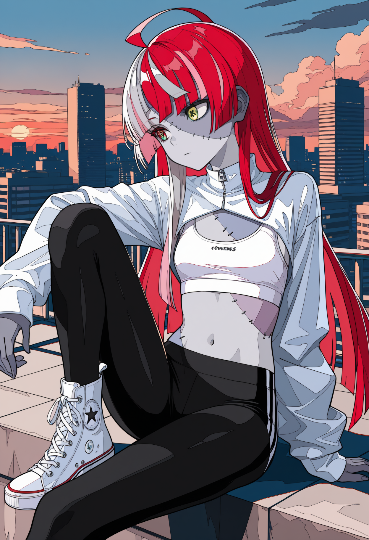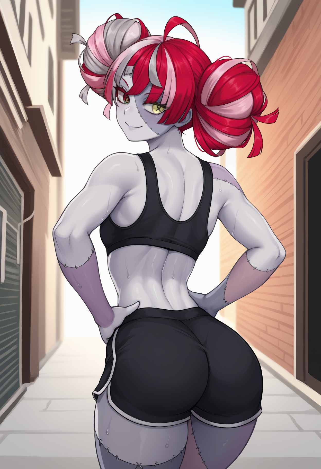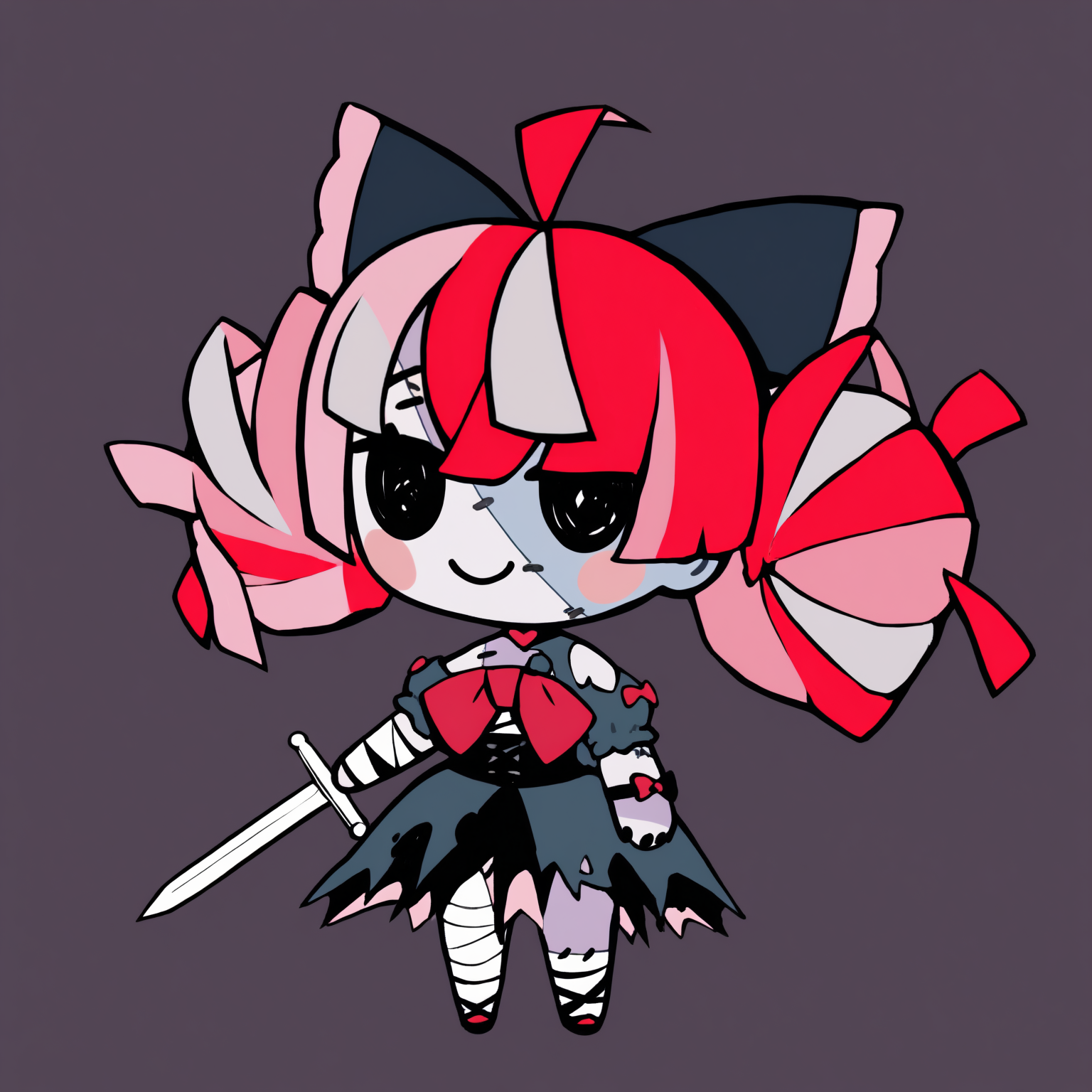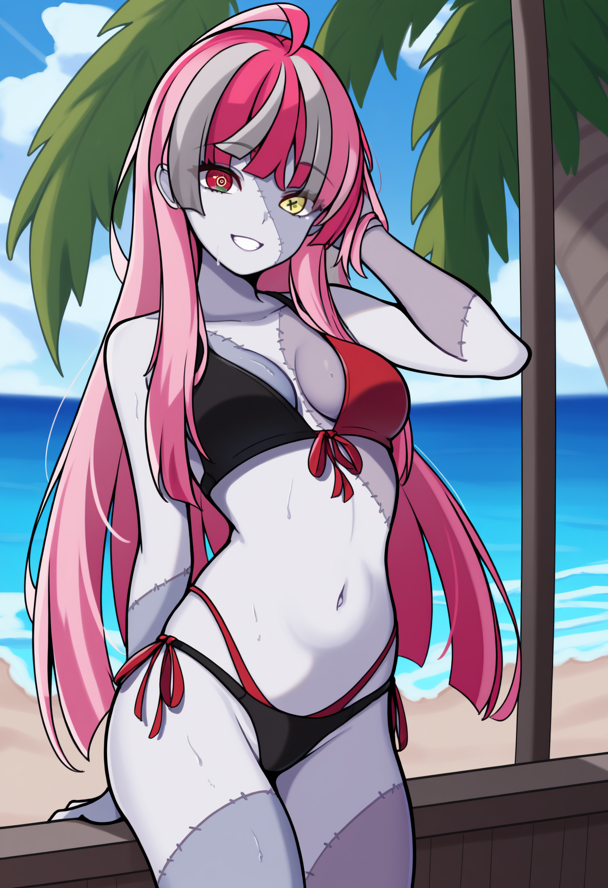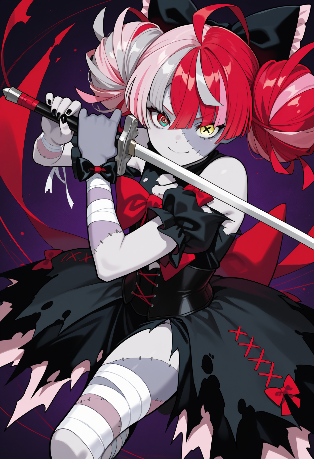 Custom Outfit: kureijirnd, zombie, two-tone skin, patchwork skin, stitches, stitched face, stitched arm, multicolored hair, red hair, pink hair, white hair, grey hair, blunt ends, double bun, hair bow, black bow, heterochromia, red eyes, yellow eyes, mismatched pupils, diamond-shaped pupils, x-shaped pupils