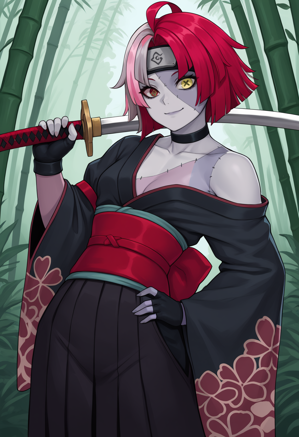 New Year (doesn't work): kureijinewyr, zombie, two-tone skin, patchwork skin, stitches, stitched face, stitched arm, short hair, multicolored hair, red hair, white hair, grey hair, ahoge, heterochromia, red eyes, yellow eyes, mismatched pupils, diamond-shaped pupils, x-shaped pupils, japanese clothes, black kimono, floral print, obi, red belt, black pants, hakama pants, black choker, nail polish, black nails, bare shoulders