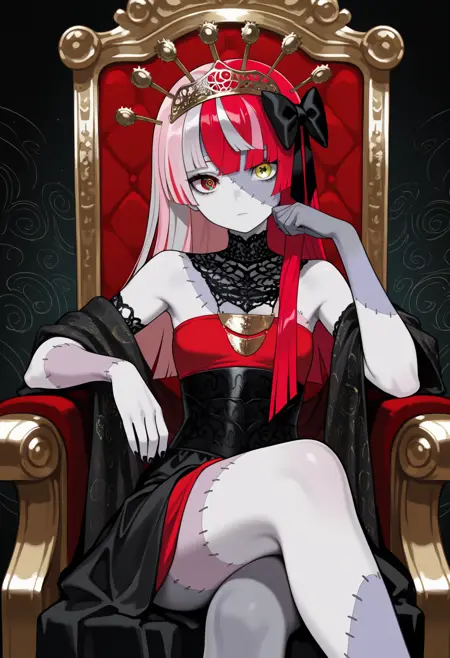 Second Costume: kureiji2nd, zombie, two-tone skin, patchwork skin, stitches, stitched face, stitched arm, multicolored hair, red hair, pink hair, white hair, grey hair, blunt ends, hair bow, black bow, tiara, heterochromia, red eyes, yellow eyes, mismatched pupils, diamond-shaped pupils, x-shaped pupils, indonesian clothes, bare shoulders