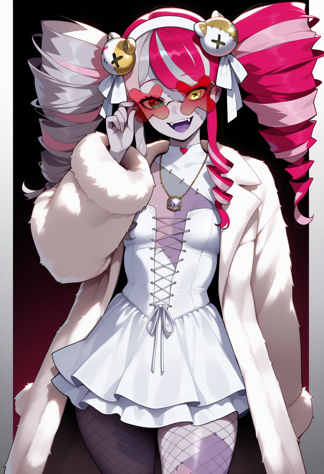 Third Costume: kureiji3rd, zombie, two-tone skin, patchwork skin, stitches, stitched face, stitched arm, multicolored hair, red hair, pink hair, white hair, grey hair, twin drills, white hairband, heterochromia, red eyes, yellow eyes, mismatched pupils, diamond-shaped pupils, x-shaped pupils, white coat, fur coat, white dress, fishnet pantyhose, pearl necklace