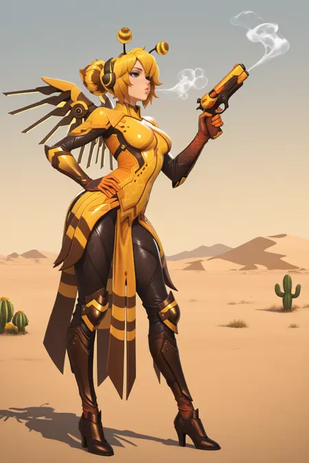 This is a character Lora for Honey Bee Mercy, a skin for Mercy added in Overwatch 2. You can use the phrases "holding honeycomb staff" and "holding honeycomb pistol" to trigger her equipment respectively. You can also use "warehouse background" to get the hero gallery look, but make sure to specify the background if you don't want that.