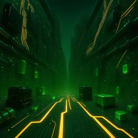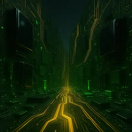 미래적인 회로 기판, 녹색 PCB 환경, 두꺼운 금색 트레이스, 빛나는 회로선, 하이테크 도시, 광택 있는 검정색 부품, 녹색 커패시터, 금색 LED, 녹색 LED, 냉각 튜브, 반짝이는 금속 튜브, 거대한 건축, 대칭적인 레이아웃, 대담한 기하학, 금속 반사, 기술 몬리스, 사이버 인프라, 초고해상도, 영화적 조명, 클로즈업 디테일, 지면 수준 시점, 저각, SF 환경, 에너지 코어, 투명 탱크, 원자로 구조, 빛나는 액체, 내장형 부품, PCI 카드, RAM 블록, CPU 코어, 미니어처 부품 없음, 과장된 요소, 무거운 기술 디자인, 깊은 그림자, 산업적인 우아함, 층층이 쌓인 표면, 회로 에칭, 미래적 질감, 조명된 통로, 데이터 고속도로