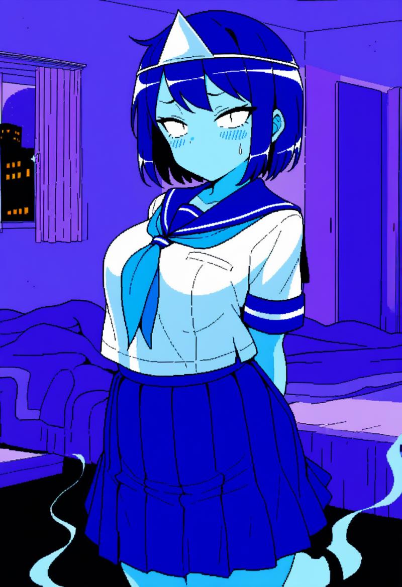 3.bitch ghost2,1girl,solo,ghost,colored skin,blue skin,blue hair,short hair,medium breasts,