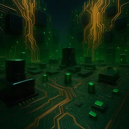 未来电路板、绿色PCB环境、厚重金色走线、发光电路线条、高科技城市、光亮黑色元件、绿色电容、金色LED、绿色LED、散热管、闪亮金属管、宏大建筑、对称布局、大胆几何、金属反光、科技巨石、赛博基础设施、超高清分辨率、电影级光影、特写细节、地面视角、低角度、科幻环境、能量核心、透明罐体、反应堆结构、发光液体、嵌入式元件、PCI卡、内存模块、CPU核心、无微型部件、超大尺寸元素、重型科技设计、深邃阴影、工业优雅、分层表面、电路蚀刻、未来纹理、发光路径、数据高速公路
