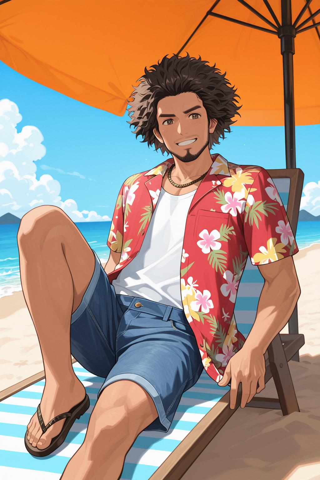 hawaii_outfit, necklace, hawaiian shirt, jeans, short pants, rolled up pants, rolled up jeans, sandals,