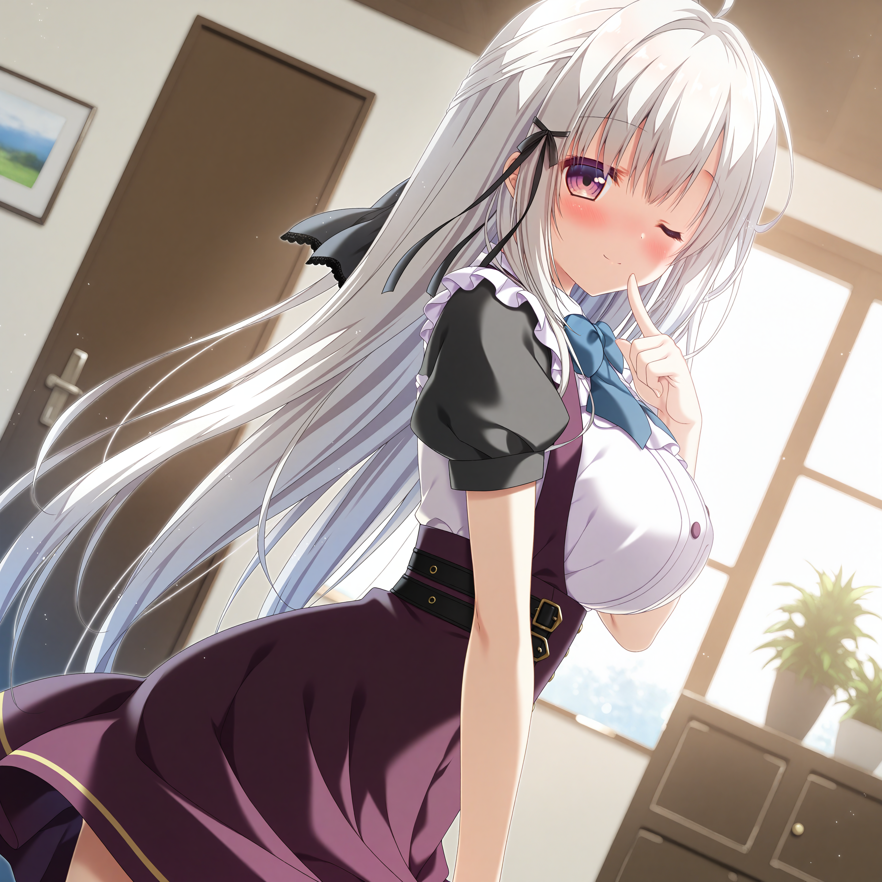 hair ribbon,black ribbon,hair bow,black bow,maid,blue bowtie,high-waist skirt,white shirt,puffy short sleeves,purple skirt,suspender skirt,frills,black belt,