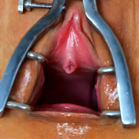 specsims, close up photo of a woman stretching her pussy with a steel specsims from above, front view, hands-free specsims, specsims fully inserted, normal pussy, pussy having short outer labia and medium inner labia, peehole, medium pussy gape with pink channel, moist pussy, shaved vulva