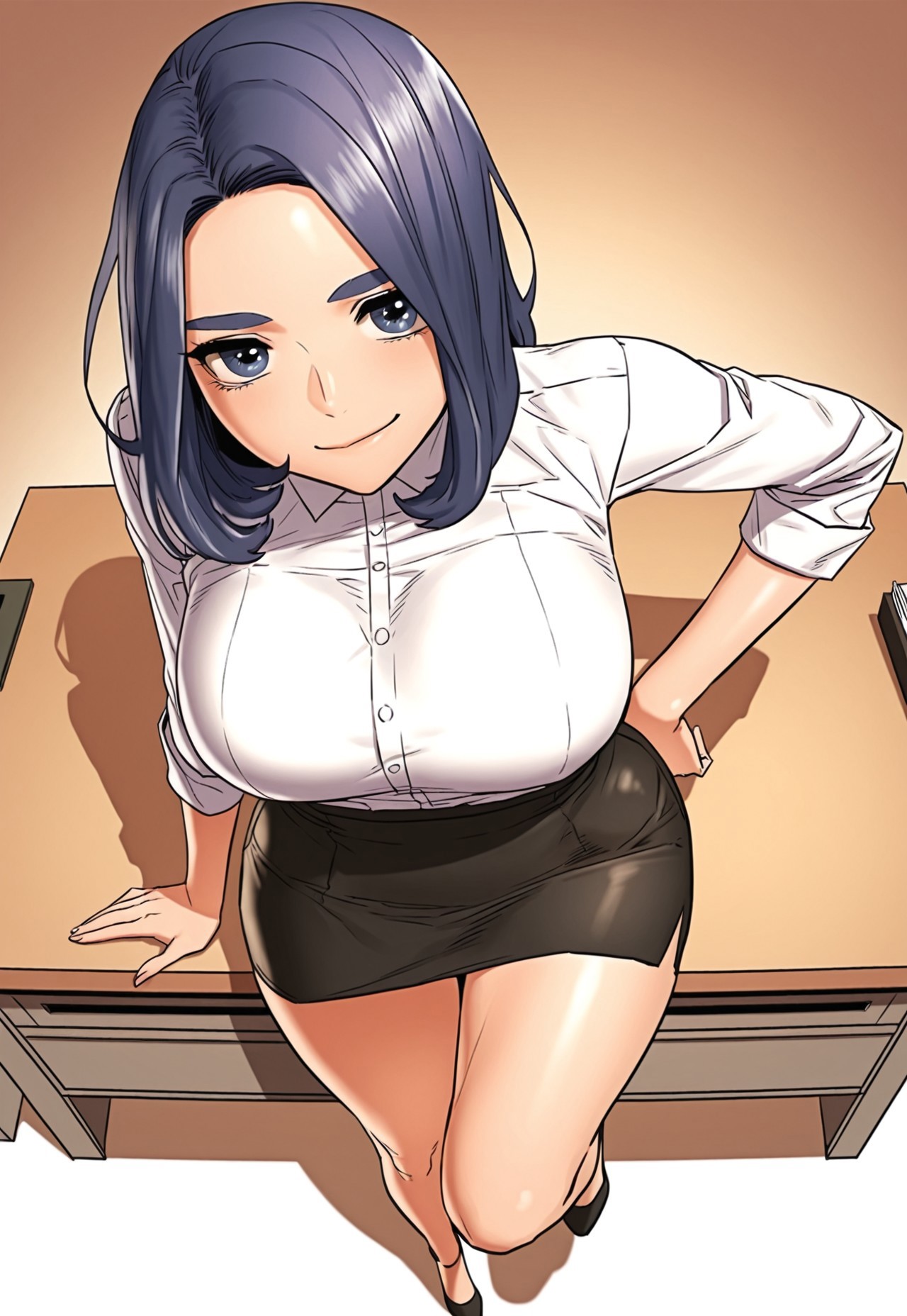 dayoung song, short straight blue hair, blue eyes, side-swept bangs, large breasts, wide hips, mature woman, manhwa, silent war