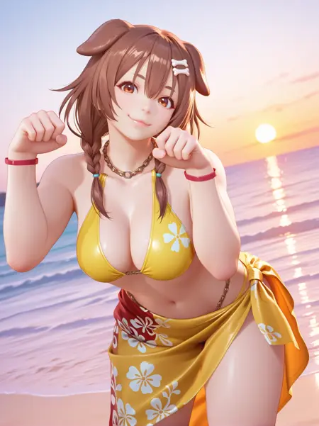 - Add: "bikini, sarong, floral print, jewelry, chain necklace, chained thong strap, necklace, bracelet"
