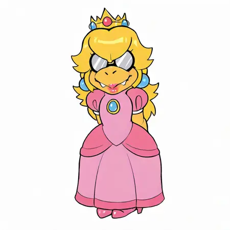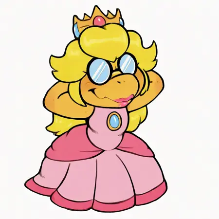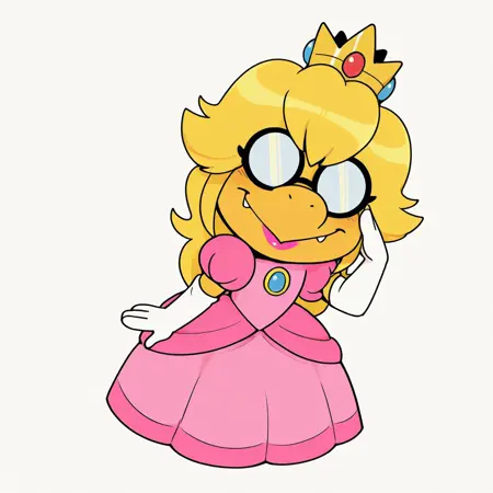 Kamek(character), femboy, male, no humans, glasses, blonde hair, crown, pink princess dress, lipstick, crossdressing,