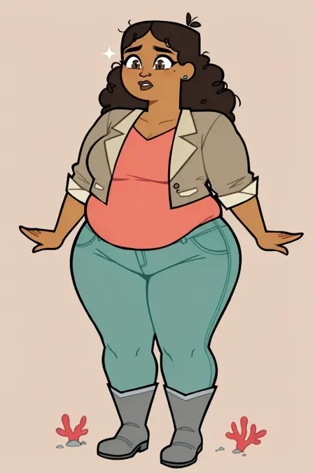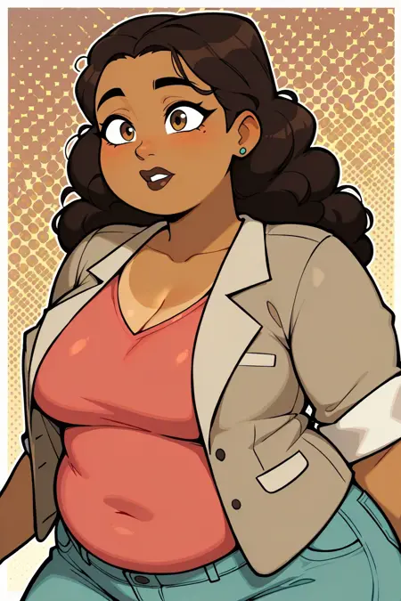 MillieTDI23, 1girl, tan skin, puffy dark brown voluminous hair, cropped light brown blazer, coral scoop shirt, turquoise jeans, gray high-heeled boots, fat, chubby, dark brown lips, big lips, millie (tdi)