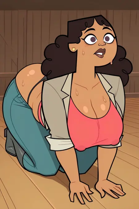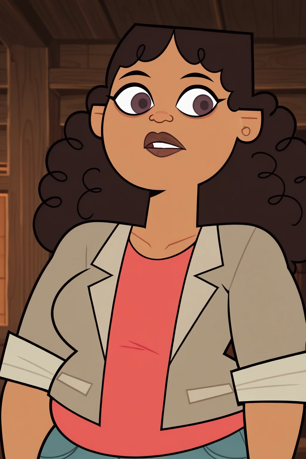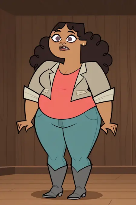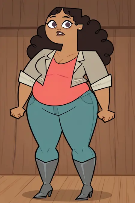 MillieTDI23, 1girl, tan skin, puffy dark brown voluminous hair, cropped light brown blazer, coral scoop shirt, turquoise jeans, gray high-heeled boots, fat, chubby, dark brown lips, big lips,