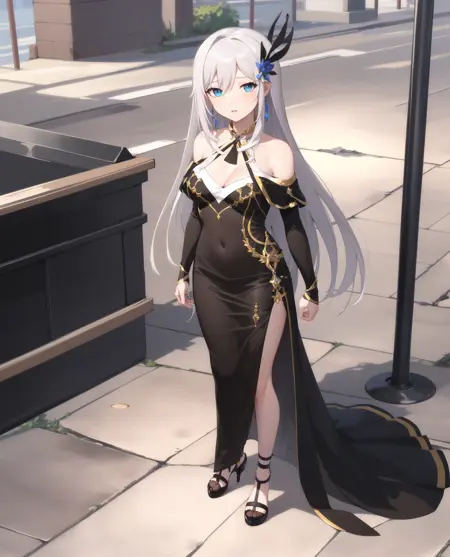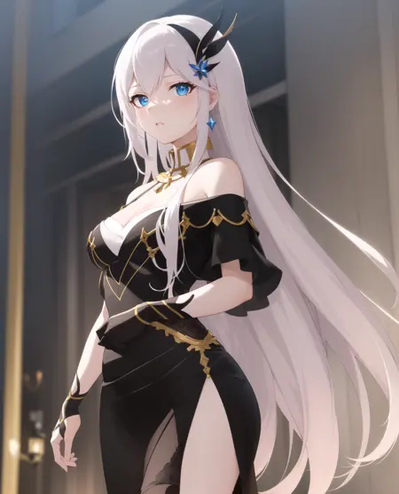 要更容易生成她的默认黑色服装,请添加“hi3 cecilia valkyrie”,或使用“hi3 cecilia dress”来生成长裙版本,不要同时使用两者,请参考示例图片中的标签和提示。