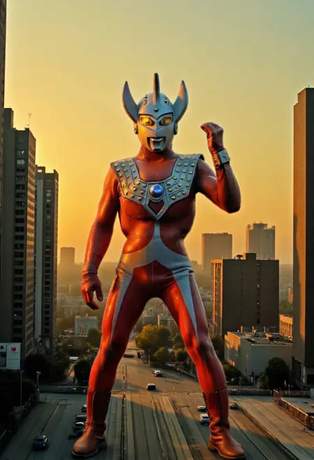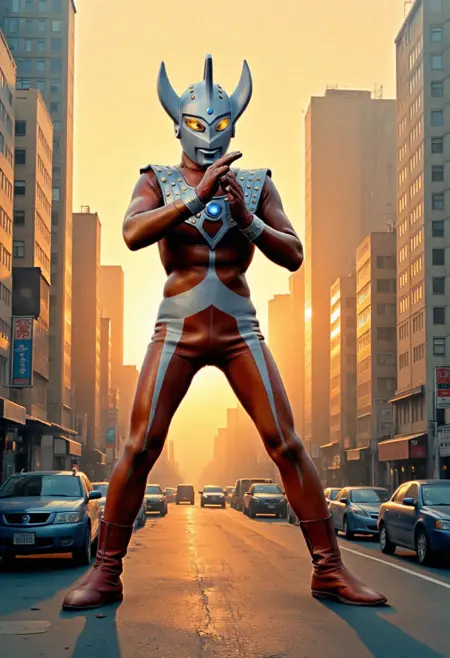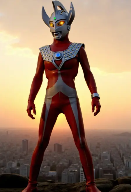 触发词:ultramantaro,站立,双臂交叉,带有角的银色头盔,黄色发光眼睛,额头上的绿色发光灯柱,银色胸甲,带有银色线条的红色橡胶紧身衣,红色手套,红色靴子,胸部蓝色发光半球形玻璃计时器,手镯
