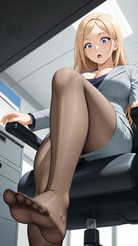 long hair, blonde hair, blue eyes, light grey suit, dark blue shirt, light grey skirt, pencil skirt, pantyhose, cleavage, office,