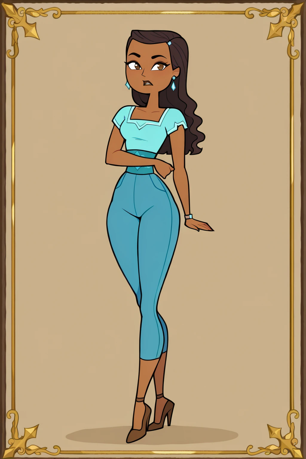 PriyaTDI23, 1girl, tan skin, dark brown wavy hair, light blue earrings, brown eyes, dark brown lips, big lips, Priya (tdi), blue pants, brown high heels,