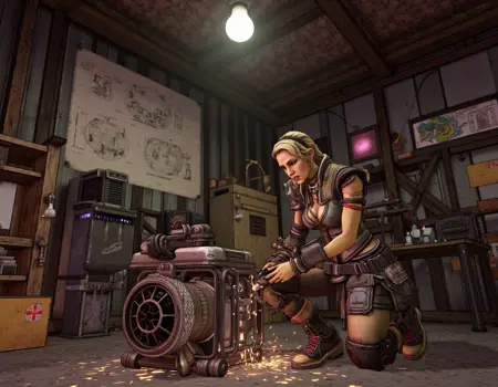 이 LoRA는 이미지 콘텐츠와 스타일을 설명하는 상세한 캡션을 사용하여 학습되었습니다. 이 방식은 특정 트리거 키워드 없이도 보더랜드 스타일을 다양한 주제에 유연하게 적용할 수 있게 해줍니다. 단순히 프롬프트에 설명적인 단어를 포함하기만 하면, LoRA가 활성화되면 생성물이 원하는 스타일로 유도됩니다.