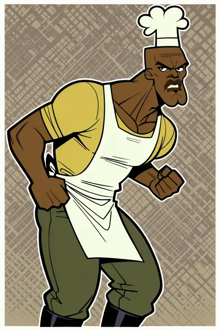 | 训练词汇 | ChefHatchet, 1boy, dark skinned male, yellow-green shirt with folded short sleeves, dark green pants, black pointed boots, white apron, white puffy chef hat, goatee, thin black mustache, lips, big lips, black eyes, bald,已复制! ChefHatchetTDR, 1boy, dark skinned male, light pink-magenta shirt, dark magenta neck tie, beige pants, dark magenta shoes, goatee, thin black mustache, lips, big lips, black eyes, bald,已复制! ChefHatchetTDI23, 1boy, dark skinned male, purple shirt, dark magenta neck tie, beige pants, dark magenta shoes, goatee, thin black mustache, lips, big lips, black eyes, bald,已复制! |