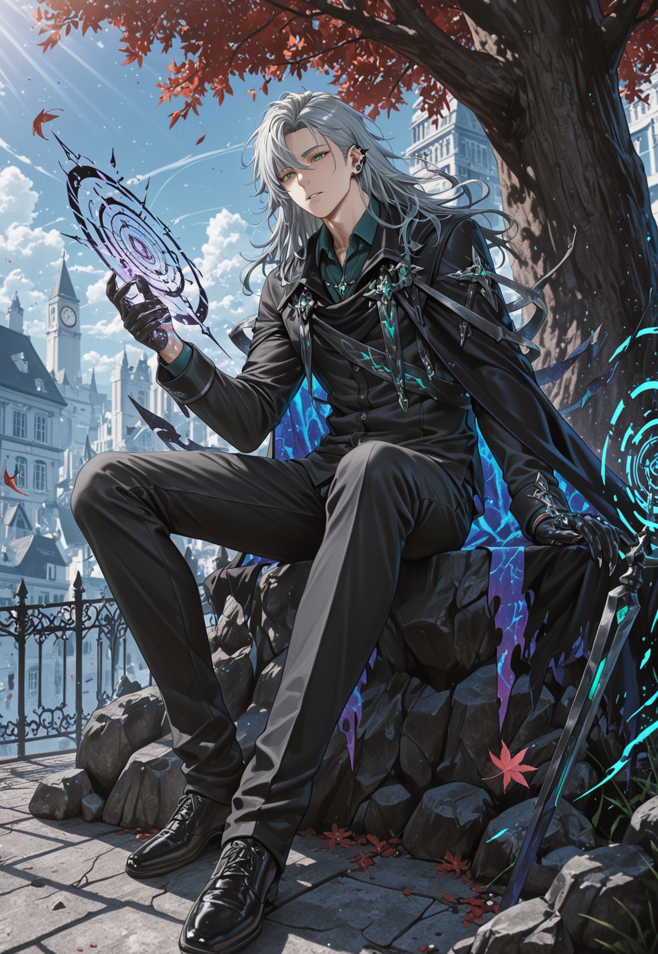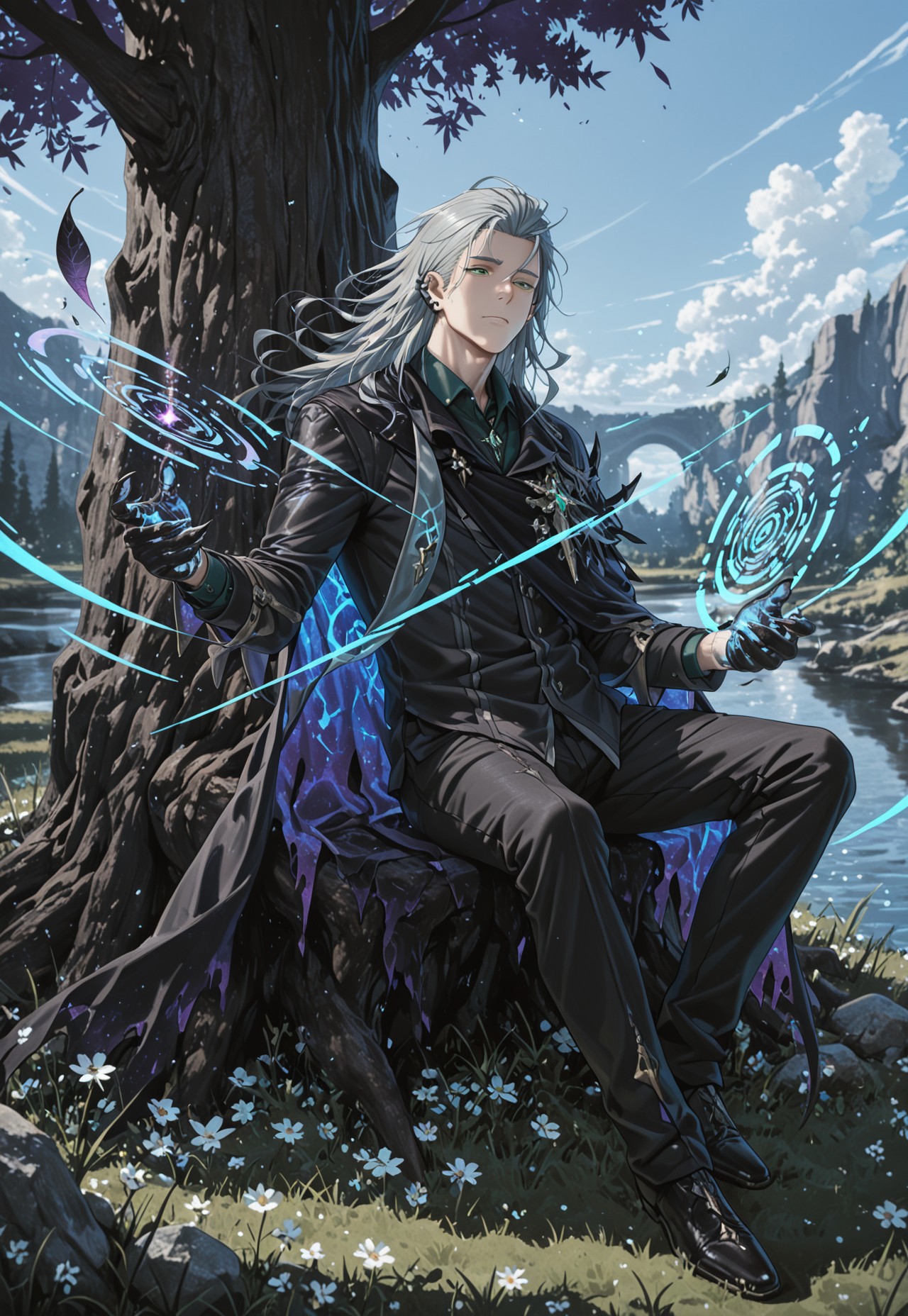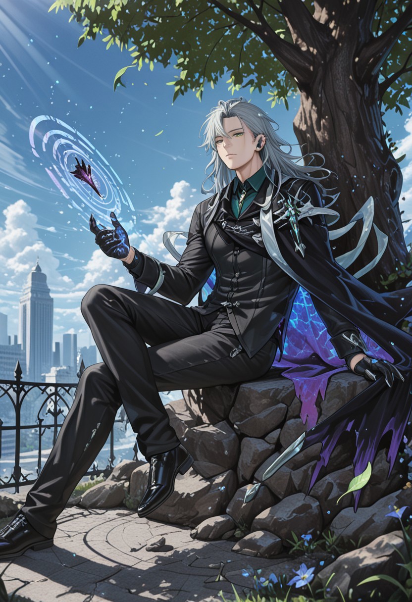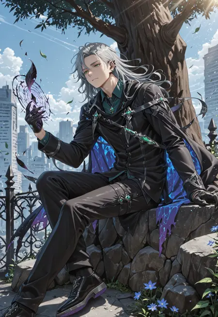 quence_grey hair, quence_green eyes,