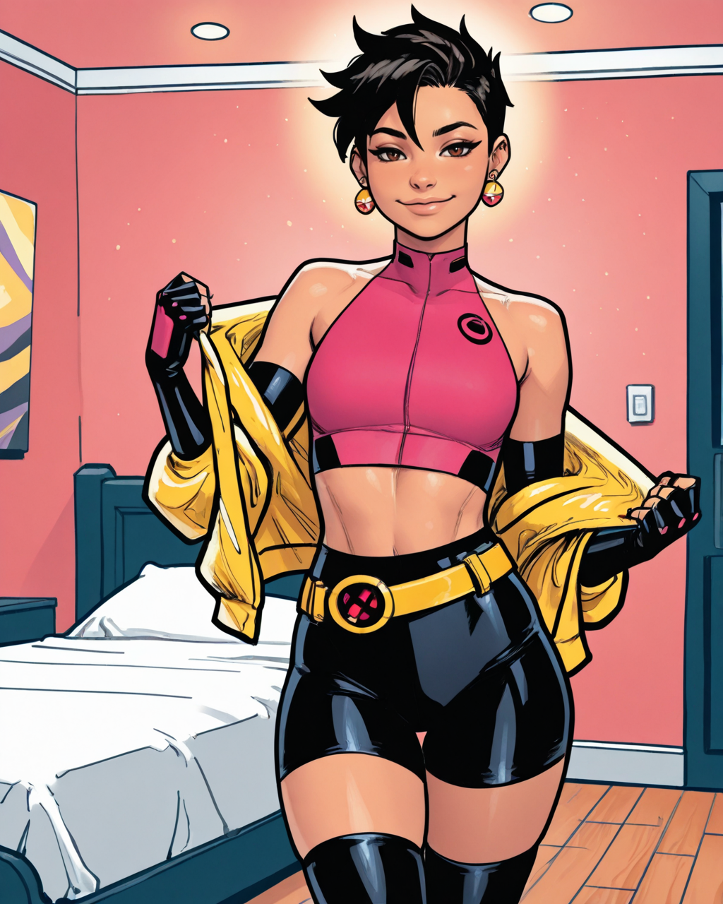 触发词:jublationlee, 1girl, 黑发, 短发, 棕色眼睛, 耳环, 眼镜戴在头上, 露脐上衣, 露腹, 自行车短裤, 腰带, 过膝袜, 无指手套, 黄色夹克