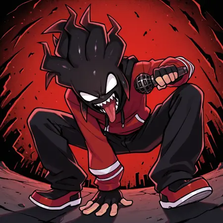标签: 男性,类人生物,怪物男孩,黑头,黑发,短发,触须状头发,头发垂下,白色巩膜,无瞳孔,尖牙