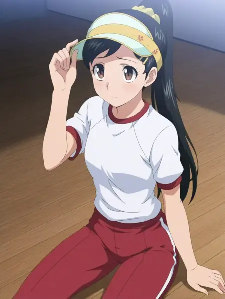 옷 3: 바이저 모자, 트랙 팬츠, 빨간 바지, 흰 셔츠