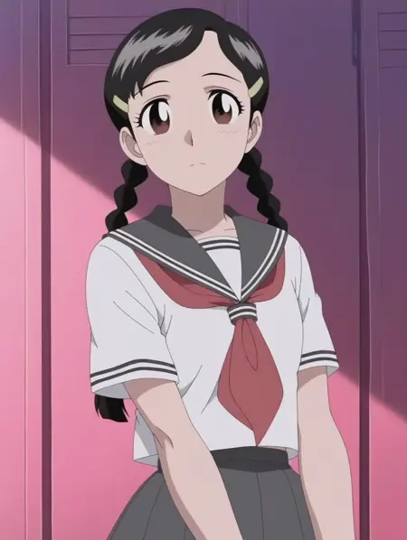 일반: 갈색 눈, 검은 머리, 헤어클립, 긴 머리