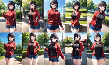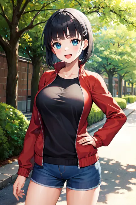 outfit3aasuguha, short hair, black hair, hairclip, green eyes, breasts, black shirt, track jacket, red jacket, long sleeves, partially unzipped, short shorts, blue shorts