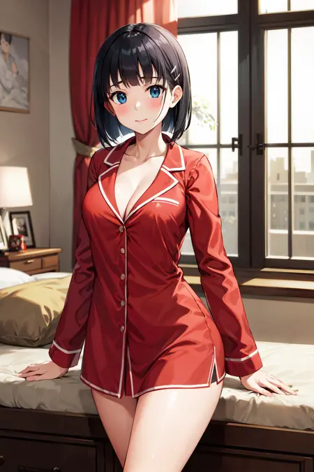outfit4aasuguha, short hair, black hair, hairclip, green eyes, breasts, cleavage, pajamas, red shirt, long sleeves, red pants