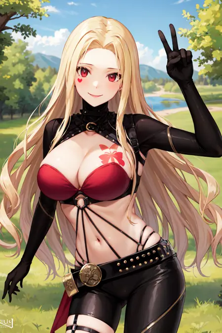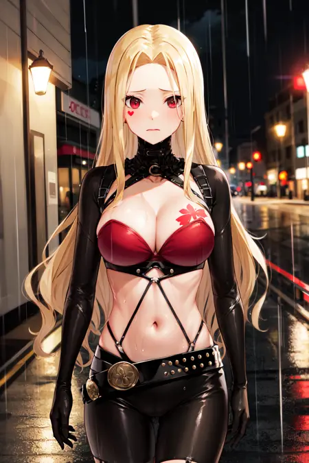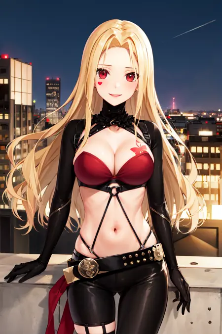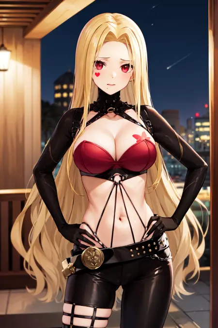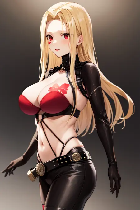outfit1aaluis, long hair, facial mark, mole under mouth, cleavage, breast tattoo, shrug (clothing), red bra, o-ring, long sleeves, black gloves, midriff, black belt, black pants, asymmetrical legwear, red thighhighs
