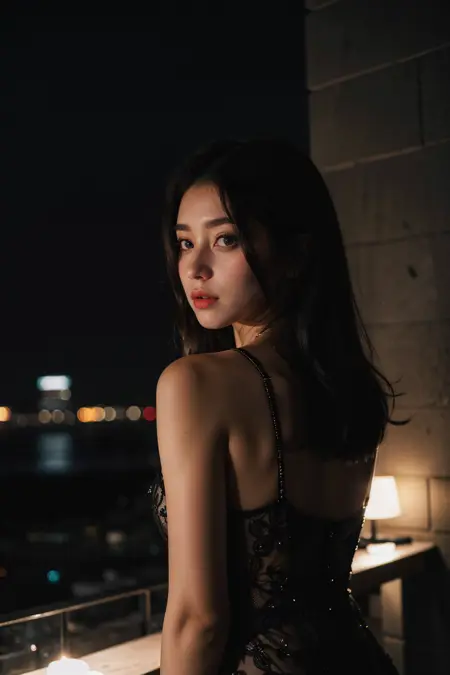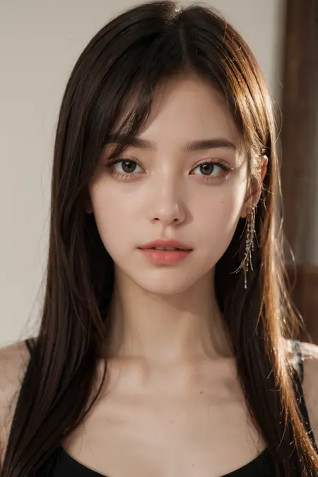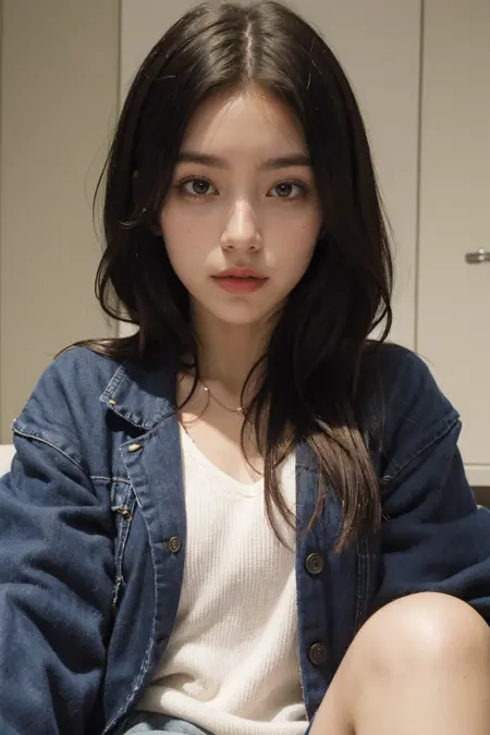 正向提示 -- (胶片颗粒:1.5),8K 原片照片,最佳质量,杰作,超高清,牛仔视角,(照片写实:1.4),专业灯光,1个女孩,单独,长发,直视观众,自然肤质,真实的眼睛与面部细节,腮红(化妆),微张的嘴唇,