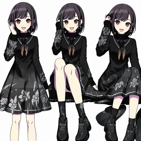 服装:1个女孩,单人,辫子,裙子,黑色鞋履,鞋子,长袖,灰色袜子,袜子,黑色裙子,棕色眼睛,短发,袖子超过手腕,棕色头发,珠宝,刘海