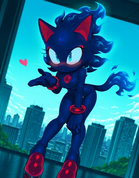 Cinder the Cat、蓝皮肤、蓝眼睛、火焰色头发、手镯、胸饰、眼线、猫尾